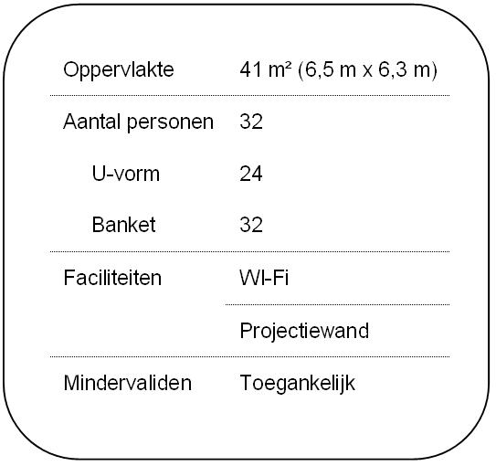 | Op de tweede etage ligt tussen de Grote Drieszaal en de Grote Hofzaal de Elsdijkzaal verborgen. Deze ruimte biedt alle privacy voor een zakelijke vergadering van maximaal 32 personen. Internetaansluiting en een witte projectiewand behoren tot de basisuitrusting van de Elsdijkzaal. De lift en aangepast sanitair zorgen er bovendien voor dat ook mindervaliden hier probleemloos terechtkunnen. |